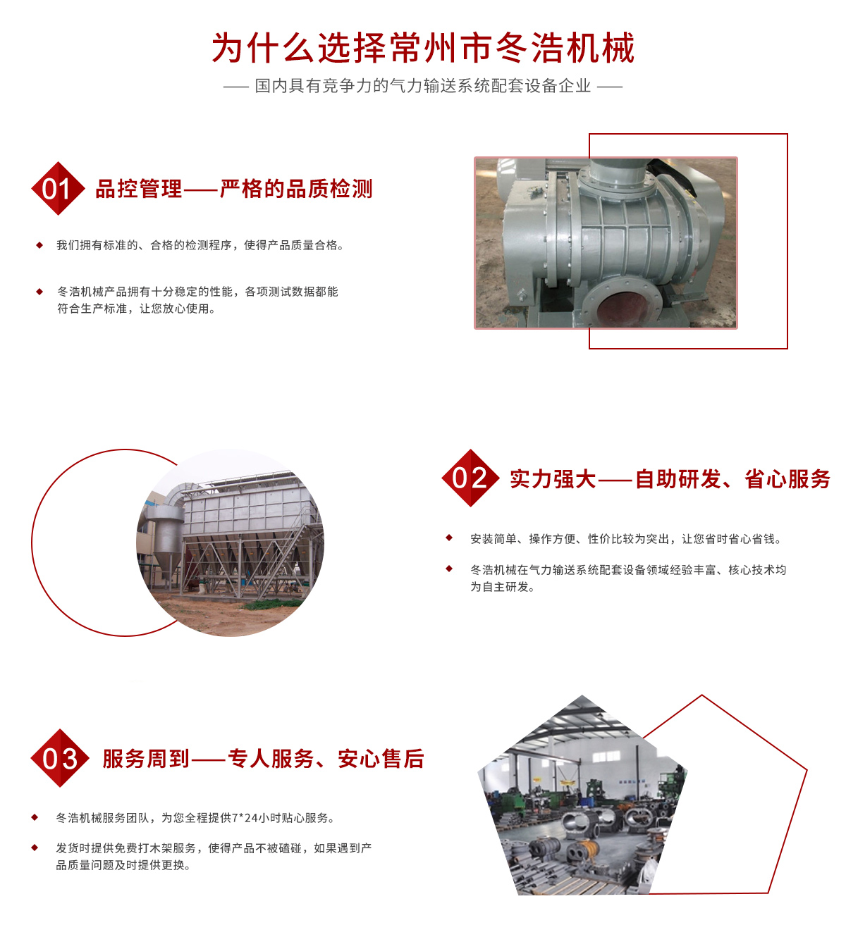 常州市冬浩機械有限公司占地面積5000平方米,擁有一支專業的科技研發(fā)團隊和配備專業的生產設備。專業致力于氣力輸送系統配套設備的研發(fā)、生產及銷售。產品在實際應用中不斷創(chuàng)新、不斷升級,現已對接實現自動化、智能化、人性化。實踐證明公司生產的吸糧機系列、高溫羅茨風機系列、關風機系列、氣力輸送設備系列、特殊工況訂制系列的產品被廣泛運用于石油化工、油脂、化工干燥、除塵、冶金、環(huán)保、電子、煤炭、建筑、電力機械、糧食、飼料等行業。為解決輸送、搬運等環(huán)節(jié)中節(jié)約大量的人力、財力;從而提高了生產效率。